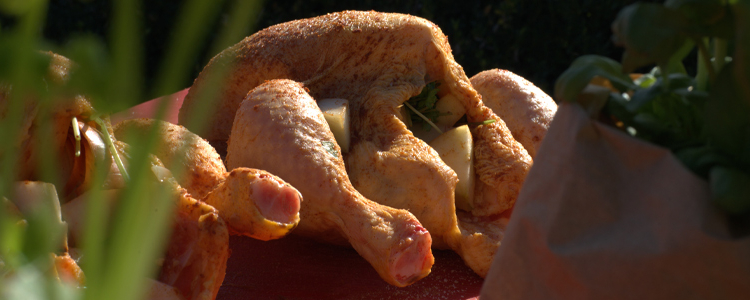 - Das Maishähnchen waschen, abtupfen und Innen wie Außen mit Salz-Pfeffer-Paprikapulver-Mischung einreiben bzw. würzen.